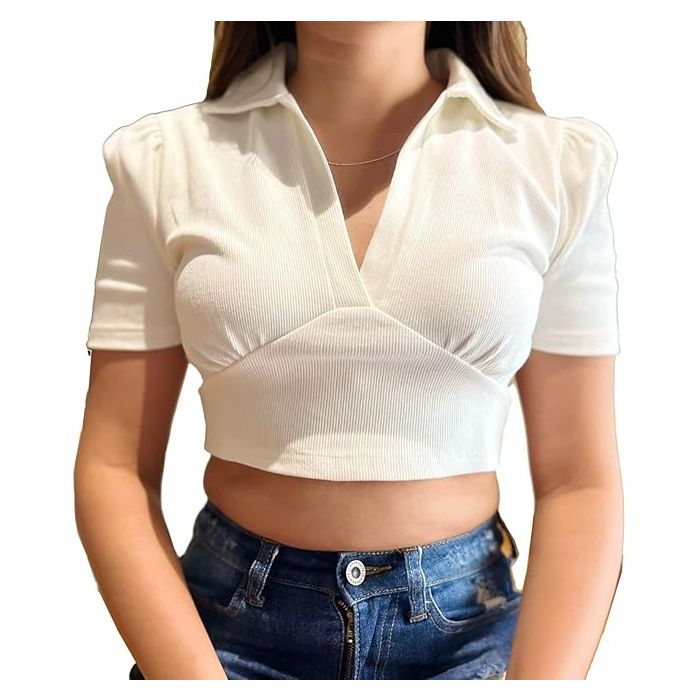 Aahwan Women's & Girls' Solid Basic V Neck Collared Ribbed Slim Fit Crop Top