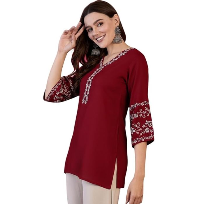 Black Rayon Tunic Top with Embroidered Sleeves, 3/4 Designer Sleeves