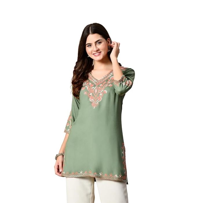Beautiful Kashmiri embroidered tunic top featuring intricate floral patterns on the V-neckline and sleeves in vibrant pink shades