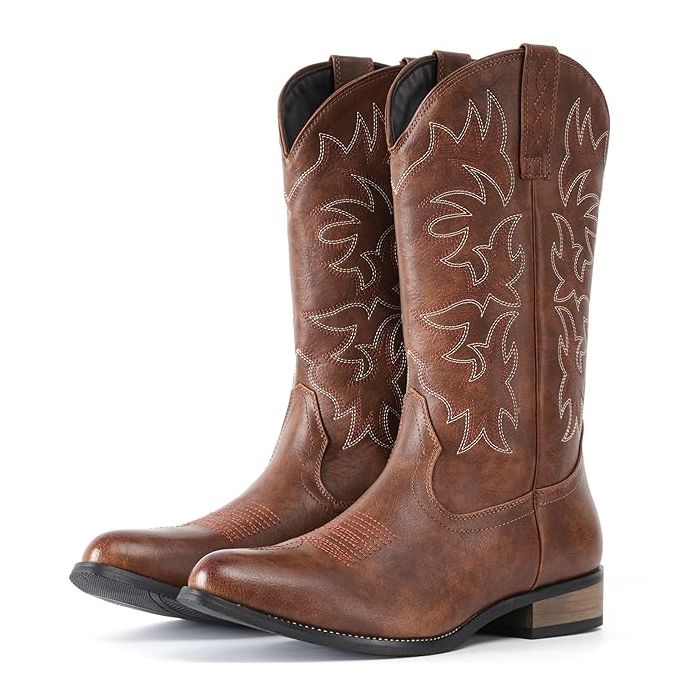 These pointed-toe cowboy boots are hand-sewn from a single piece of faux leather