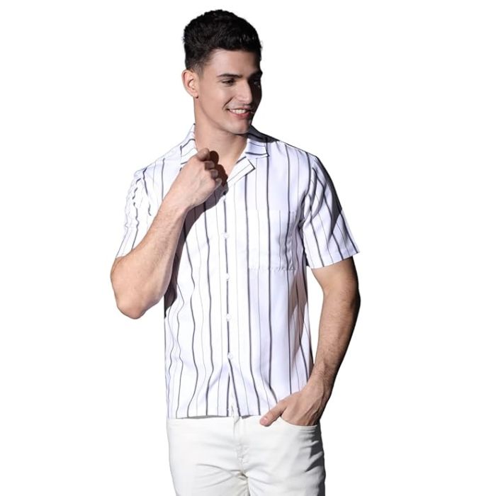 Stay stylish and comfortable with this multicolor rayon shirt featuring a fancy striped print and preppy half sleeves with a side pocket. Designed with a relaxed fit and Hawaiian collar, it’s perfect for beach, casual, office, or party wear.