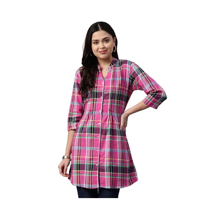Stylish plaid print tunic designed for women, featuring a waist belt for a flattering fit and 3/4th sleeves for all-day comfort. Made from soft cotton fabric for breathability and ease of care.