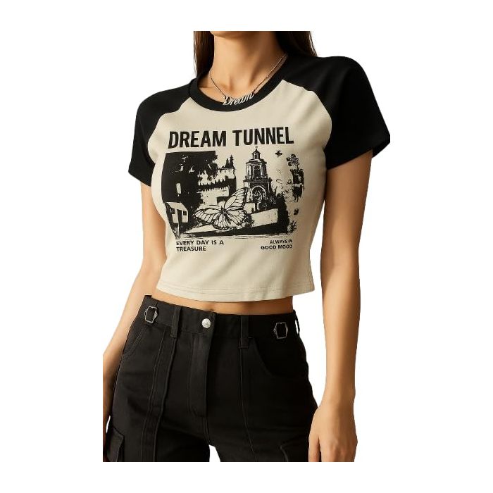 Wear Wild Women's Dream Tunnel Graphic Cotton Ribbed Round Neck Short Sleeve Casual Slim Fit Crop Tops